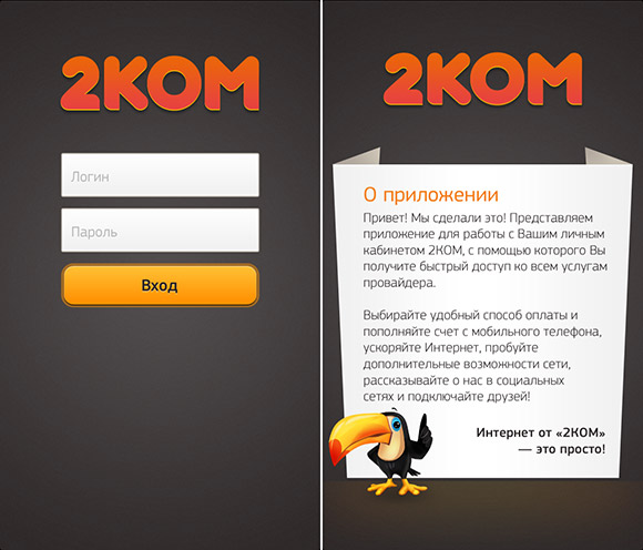 В принципе несложно реализовать отдельную оболочку для сайта провайдера, представив ее в виде мобильного приложения, но опыт работы с таким не особо отличается от использования мобильного браузера. Зачастую не всегда легко разобраться в дебрях меню онлайнового личного кабинета на сайте провайдера и через настольный браузер, что уж говорить о мобильном браузере на маленьком экранчике смартфона. Но компания 2КОМ пошла по более сложному пути создания отдельного приложения, максимально адаптированного под экран iPhone и использующего принципы интерфейса iOS. Результат порадовал, но обо всем по порядку.
