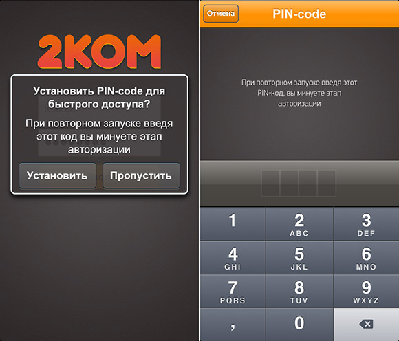 Для доступа к личному кабинету традиционно требуется иметь учетную запись на сайте провайдера, которая обычно оформляется при подписании договора. Проблема тут лишь в одном — компания зачастую сама назначает некий неказистый логин и пароль из несвязного набора цифр и букв. Каждый раз приходится входить по бумажке. В мобильном приложении этой проблемы не будет, так как есть защита PIN-кодом. При первой авторизации через мобильное приложение 2КОМ назначаете пароль из четырех цифр, и в будущем для подключения к личному кабинету достаточно ввести только их. Мелочь, конечно же, но она серьезно облегчает жизнь, если доступ к кабинету требуется часто.