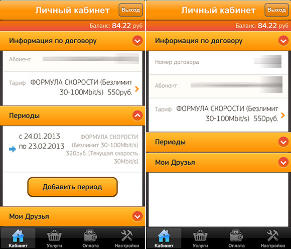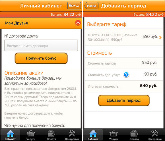 У этой компании много разных услуг и доступ к личному кабинету может частенько требоваться как для и использования, так и для пополнения счета. Кроме того, в разделе «Кабинет» можно, так сказать, спланировать свой доступ в интернет, задав определенные периоды с определенными тарифами. Часто используемая провайдерами схема типа «Приведи друга, получи плюшку» тоже интегрирована в программу. Прямо внутри нее можно ввести номер договора товарища и оформить бонус. Это удобнее, чем куда-то записывать цифры, потом входить с домашнего компьютера в личный кабинет и вносить данные.