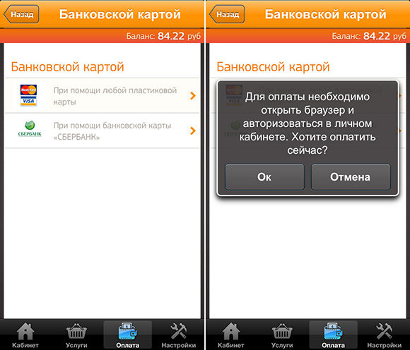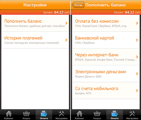 Традиционно через личный кабинет можно пополнить счет, чтобы не беспокоиться об исчезновении доступа в интернет в самый неподходящий момент. Вариантов пополнения масса, включая банковские карты, электронные деньги и т. п. Правда, в большинстве случаев придется перейти в мобильный браузер и на сайт платежной системы. История платежей хранится в этом же разделе.