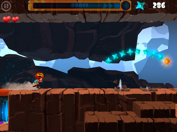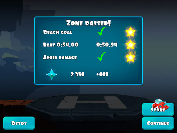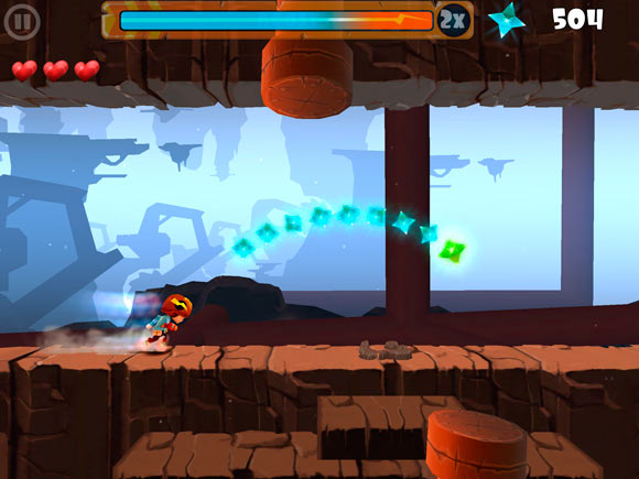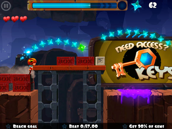 Теперь про игровой процесс. Те кто играл в Rayman Jungle Run наверняка быстро освоятся и в Rock Runners. Персонаж бежит самостоятельно, а все, что требуется от игрока – это нажимать вовремя на экран, совершая прыжки или пару других действий. В наследство от раннеров достались препятсвияи и классические бонусы вроде щита и магнита. А у классических платформеров игра позаимствовала три жизни-сердечка и общую стилистику. По итогам уровня подводятся результаты. Максимум – три звезды.
