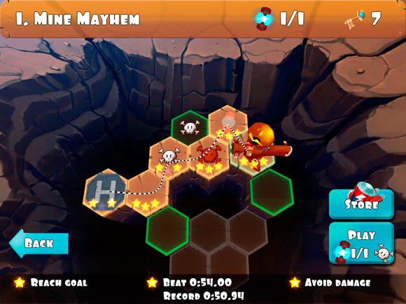 Смысл всего происходящего на экране вашего iДевайса заключается в желании героя поскорее убраться на космическом корабле с определенной планеты. Для этого нужно во-первых, добраться до корабля, а во-вторых, раздобыть по пути топливо и выполнить несколько несложных задач. Именно таким образом и происходит деление на уровни. Сперва выбирается одна из трех доступных планет. Затем мы видим поле, состоящее из шестиугольников, каждый из которых это отдельный уровень. Герой и его корабль, разумеется, находятся на разных концах игрового поля. Поэтому проходя уровни и выбирая дальнейшее направление движения мы постепенно перемещаем персонажа к цели.