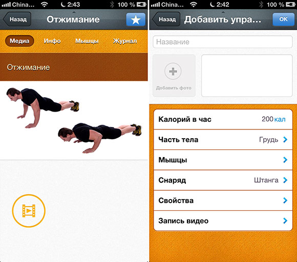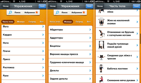 Без начальной справки в Fitness потеряться очень легко и то, о чем я писал в начале статьи — это все правда: информации просто море. Хотите упражнений? Вот вам на каждую группу мышц по несколько десятков с картинками, видео и несколькими вариантами сортировки, а если мало, то можете и свое добавить: