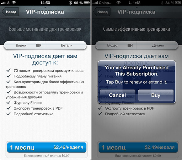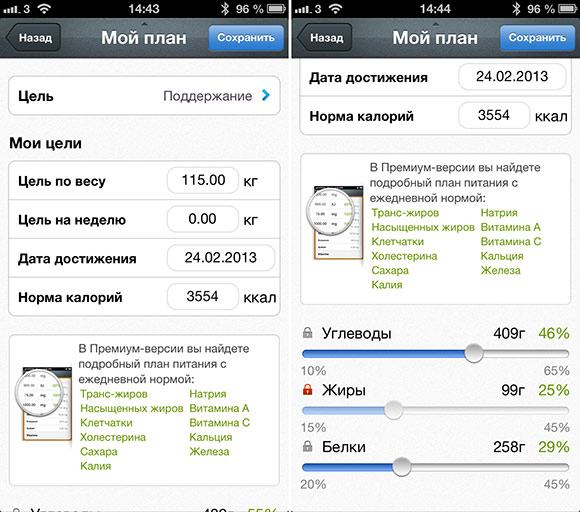 Можно еще и рекомендации получить, сколько каких нутриентов желательно употреблять и сколько воды выпивать, но это уже за деньги в рамках платной подписки за 330 рублей в месяц или же за 1600 рублей в год. Там еще и другие фишки для «платников» есть, вроде индивидуальных тренировок (за годовую подписку), данных о содержании нутриентов в продуктах питания, фирменного журнала, экспорт тренировок в PDF (да-да, только за деньги) и еще пара-тройка «плюшек»: