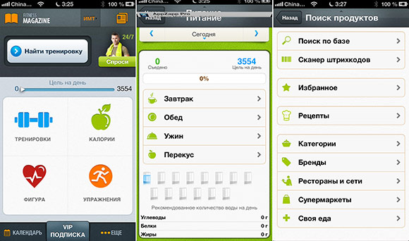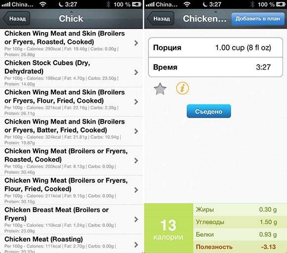 Но тренировками дело не заканчивается. Мышцы ведь из воздуха не строятся, надо еще и кушать хорошо, а самое главное — правильно. Так что придется вам, товарищи, заносить каждое блюдо, каждый продукт, все, что за день потребляете и выпиваете в отдельный раздел приложения «Калории» (проблема только в том, что продукты питания не локализированы, все на английском — это очень неудобно):