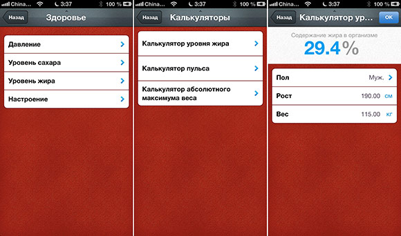 И это не все! Надо ведь за фигурой следить, чтобы видеть, так сказать, результат работы. В соответствующем разделе Fitness тоже предлагает немало, начиная с ежедневного добавления объемов каждой части тела, продолжая описанием состояния здоровья (давление, уровень сахара, жира и даже настроение). Тут же есть и всякие калькуляторы:
