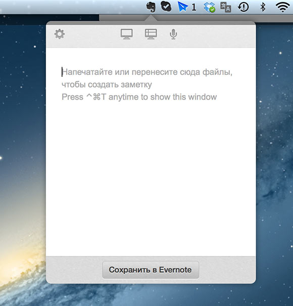 Для доступа к Quick Note достаточно кликнуть по иконке Evernote в системной панели OS X или с помощью комбинации клавиш «cmd + ctrl + N». Помимо текста в поле ввода можно перетащить изображение или же сделать голосовую запись. Если не устраивает мелкое окно, то одним нажатием оно расширяется на весь экран.