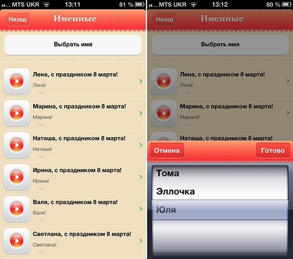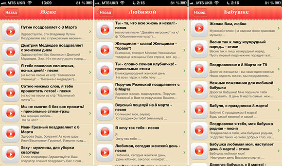 А приготовили они немало. Предполагаю, что поздравительных речей в программе далеко за сотню, но все они разбиты по тематическим разделам и запутаться будет сложно. Жене, любимой, бабушке, сестре, дочери, подруге — все есть. А хотите отправить именное поздравление? Без проблем! Правда, не забывайте, что в их тексте отличается только имя, все остальное идентично. Так что близким подружкам, которые захотят совместно обсудить такую активность с вашей стороны, лучше идентичные поздравления не слать.