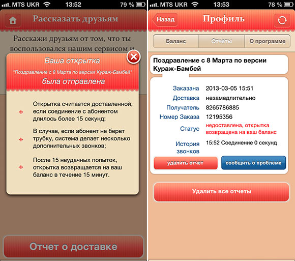 Бесплатно дается одно поздравление. Хотите больше? Придется заплатить через InApp. Не стоит волноваться, что виртуальная открытка не дойдет до адресата, и вы зря потратите время. Если дозвон не удастся, то спустя несколько попыток открытка вернется на ваш баланс. Но даже в случае, когда абонент возьмет трубку, попытка его поздравить будет засчитана только через 15 секунд прослушивания.