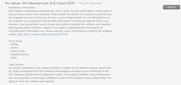 В последнее время практика молчания со стороны Apple в отношении черновых версий OS X 10.8.3 стала привычной. О каких-то определенных проблемах, компания не упоминает, хотя есть ряд уточнений. Например, она отметила необходимость обратить разработчикам внимание на работу AirPlay, AirPort, игрового сервиса Game Center, графических драйверов и браузера Safari. Также в сообщении традиционно есть напоминание о стандартных мерах предосторожности для защиты данных при работе с «сырой» версией операционной системы.