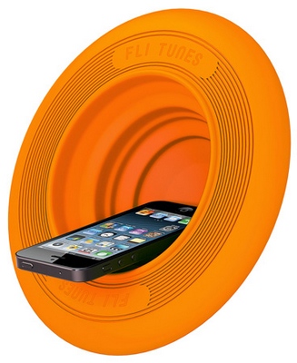 Одного взгляда на фотографии достаточно, чтобы потерять пару очков IQ от когнитивного диссонанса. Перед нами — Fli Tunes, диск для игры в фрисби. Причём тут iPhone? Оказывается, в игрушке есть один небольшой секрет. Выемка посреди диска служит не только для улучшения аэродинамических качеств, но и для увеличения громкости динамиков любого устройства, вложенного внутрь. Гениально?