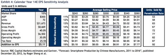 Само собой на дешевом iPhone компания будет зарабатывать меньше, чем на iPhone 5 или 5S. Тем не менее, валовый доход от его продаж якобы может составить $22 млрд и более $5 дохода на акцию в 2014 году. Это в свою очередь повысит стоимость одной акции Apple в среднем на $50. Такой вывод аналитик сделал, предположив, что объем рынка недорогих смартфонов в 2014 году составит примерно 500 млн устройств. В свою очередь Apple сможет захватить до 15% доли этого рынка, а это около 70 миллионов недорогих iPhone.