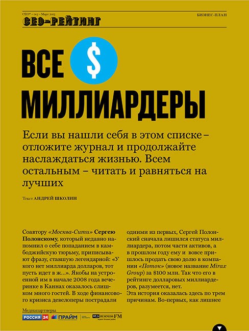 Дело в том, что в журнале CEO появилась новая рубрика «Рейтинг», и обложка мартовского номера фактически является анонсом этого события. В данном случае речь идет о рейтинге долларовых миллиардеров России.