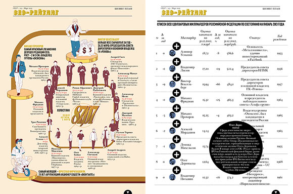 Что касается рейтинга в номере, то это не просто скучная таблица со статистическими данными, а целый рассказ о долларовых миллиардерах России, о том, как менялся их бизнес в последние несколько лет, что происходило с капиталами, почему кто-то смог занять более интересную позицию, а кто-то не смог попасть в первую десятку, хотя должен был.