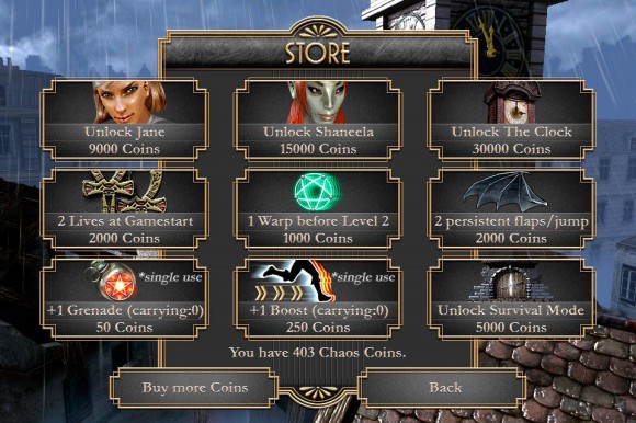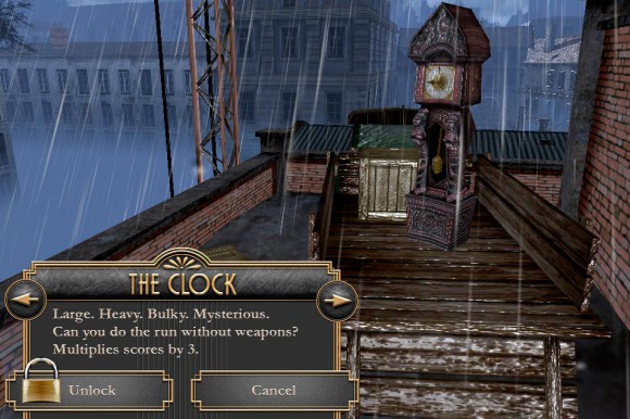 За бешеные деньги можно разблокировать новых героев, одним из которых являются… старинные часы. Пострелять вам в таком случае не доведется, однако очков получите больше. Из дешевых вещиц в наличии имеются только гранаты и ускорение. На практике и то, и другое, оказывается бесполезным: взрывы можно заменить отстрелом зверья, а излишняя поспешность лишь увеличит ваши шансы преждевременно сигануть с крыши.