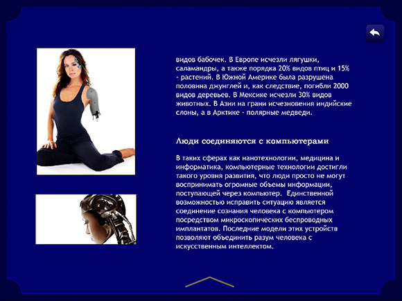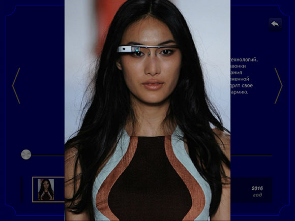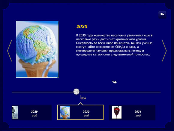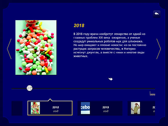 В «Навигаторе по будущему» базовый текстовый блок включает краткую информацию о том, что же глобального и важного произойдет в жизни планеты в определенный год. Если есть желание узнать подробнее, то достаточно кликнуть на стрелочку под текстовым блоком, что уберет «Луч Времени» и заполнит все полезное пространство текстом и иллюстрациями: