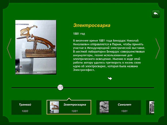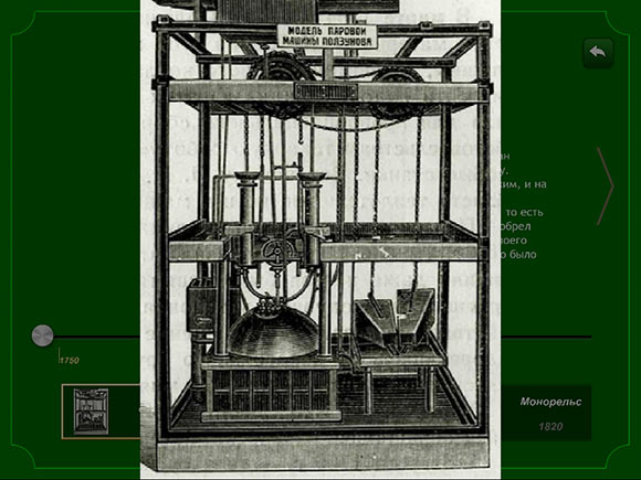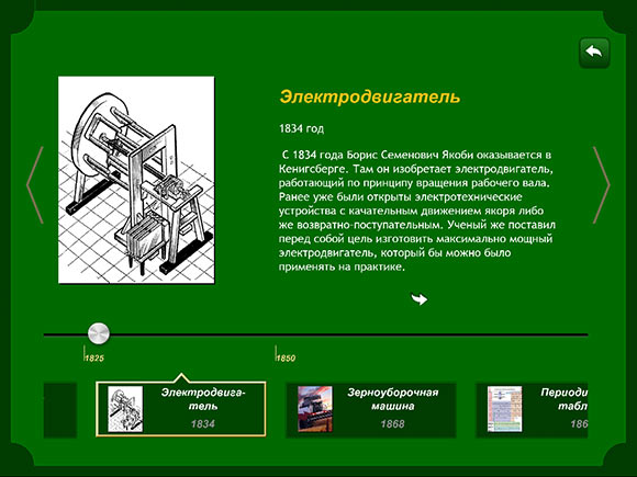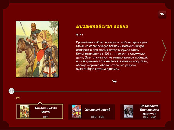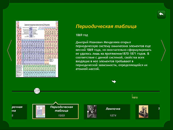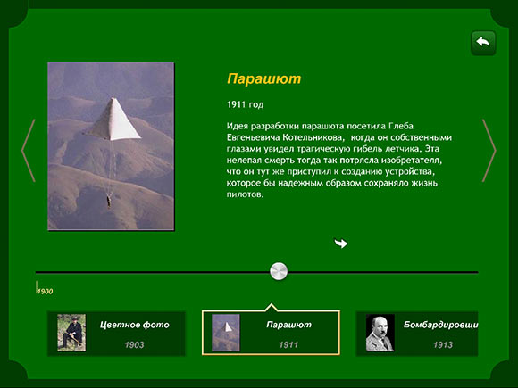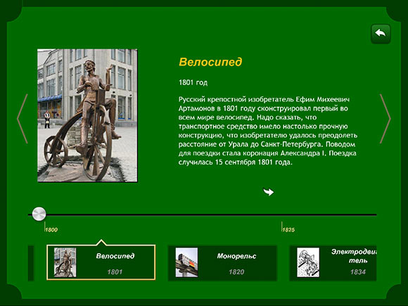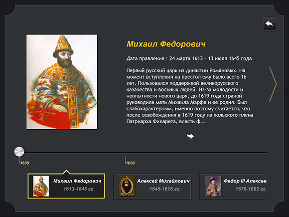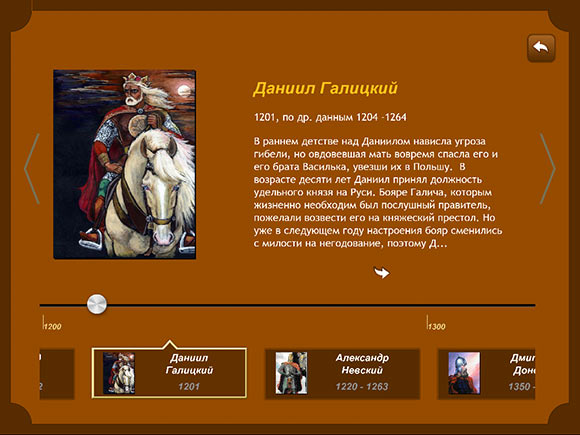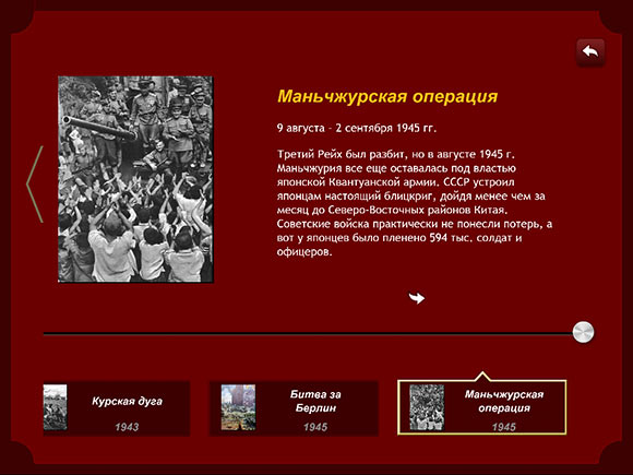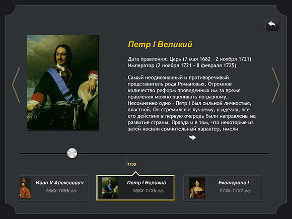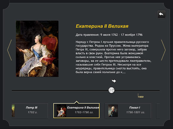 Минимализм продолжается и в информационном разделе, хотя в данном случае это ни плохо, ни хорошо. Просто таков вариант оформления, а именно, текстовый блок, занимающий основную часть экрана, иллюстрация слева и так называемый «Луч времени» в нижней части экрана, позволяющий быстро перемещаться между событиями.