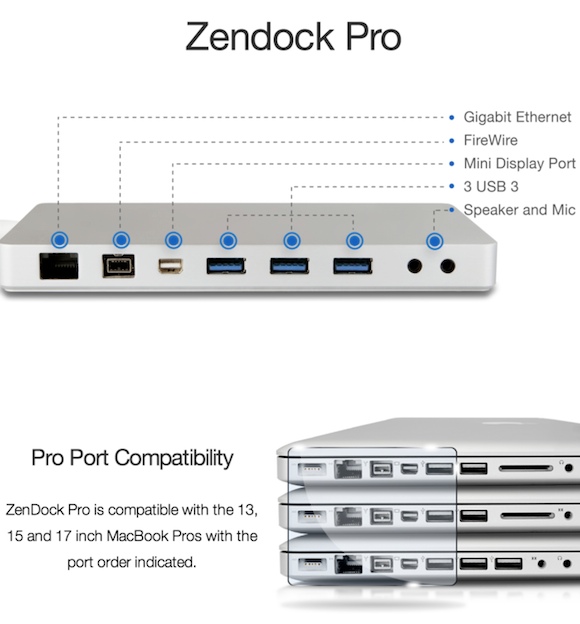 Вместо того, чтобы закрывать целиком одну из сторон ноутбука или всё днище, ZenDock разделен на две части: базу и блок со штекерами. Блок занимает порты Thunderbolt, USB, Etherntet, FireWire и MagSafe. Кабель от него простирается до базы с тремя портами USB 3.0, раздельными миниджеками для наушников и микрофона, портом Mini-Display, Ethernet и FireWire.