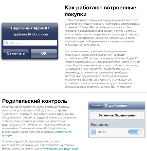 Apple в более-менее понятной форме объясняет, что после ввода пароля в течение 15 минут действует «окно», и покупки в этот момент будут совершаться без подтверждения идентификации. Есть и инструкции как по отключению внутриигровых покупок, так и по смене параметров частоты запроса пароля — всё то же самое, что было в нашем справочном материале об ограничении или отключении In-App.