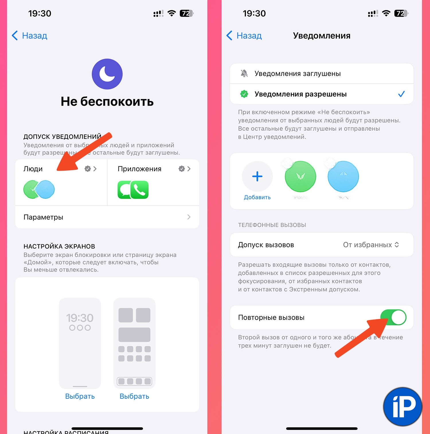 Как настроить: на айфоне родственника перейдите в Настройки – Фокусирование – Не беспокоить, нажмите на кнопку Люди и включите тумблер Повторные вызовы.