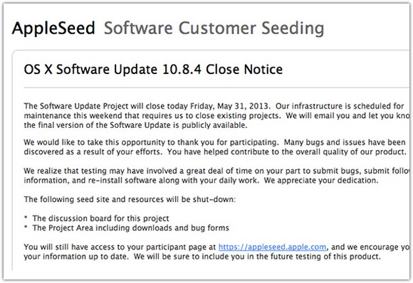 О программе AppleSeed слышали лишь единицы, и ещё меньше являются её участниками. Это избранные пользователи продуктов Apple, раньше других получающие бета-версии обновлений OS X для тестирования. Накануне все члены программы были уведомлены, что Apple в ближайшее время закроет возможность обновляться до промежуточных сборок OS X 10.8.4. Это нормальная практика и, как правило, это происходит перед выходом финальной, общедоступной версии.