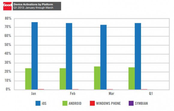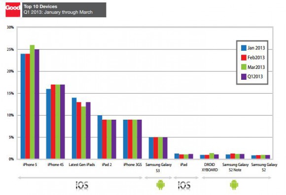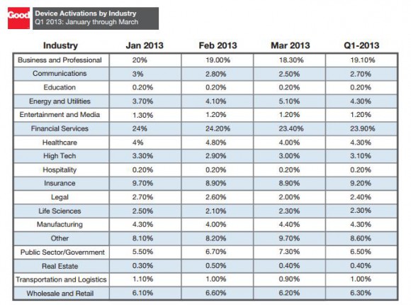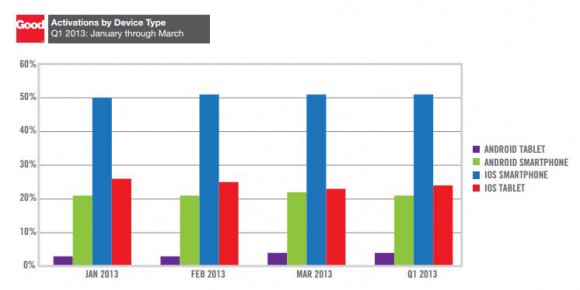 Good Technology, занимающаяся обеспечением безопасного доступа к корпоративным данным с мобильных устройств, опубликовала сегодня свой отчет за первый квартал 2013 года. Работая с компаниями, чьи имена числятся в списке FORTUNE 100, Good Technology получает достоверную информацию о том сколько, каких устройств, на каких операционных системах, кем и когда было активировано. Проанализировав данные первого квартала GT опубликовала собственные исследования, которые оказались достаточно интересны.