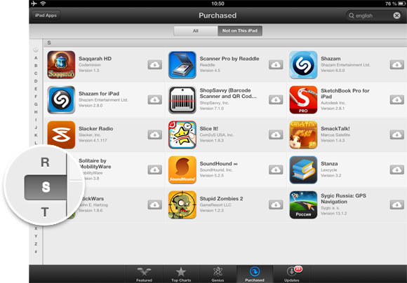 Второе. В закладке Purchased, куда многие заходят раз в год или вообще не догадываются о ее существовании, слева выросла полоска с алфавитным указателем для быстрого поиска купленного.