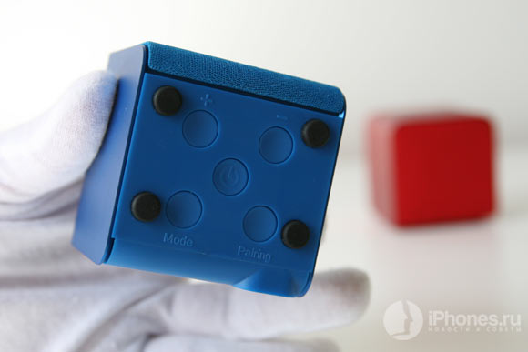 Все органы управления скрыты на нижней панели, а на задней есть лишь порт microUSB для подзарядки. Минимализм во всей красе. Стоит отметить, что колонка способна проработать без подзарядки до 20 часов — весьма впечатляющий результат в сравнении со многими аналогами, предлагающими не более 7–10 часов. При этом масса устройства составляет всего 175 г. Эдакий увесистый кубик с длиной стороны в 60 мм.
