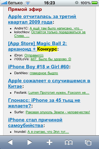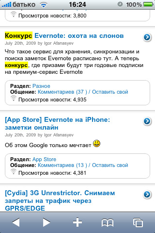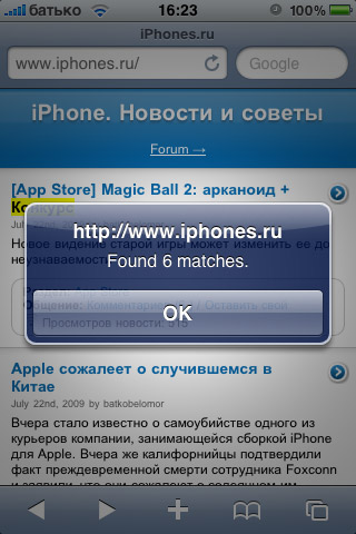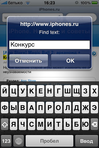Все, что необходимо сделать – это скопировать все без остатка содержание файла в адрес любой закладки на своем iPhone, а саму ее назвать “Поиск текста” или как-то так. Для проверки работоспособности идем на тот же iPhones.ru и ищем слово “конкурс” (на самом деле будто пытаемся перейти с сайта по закладке “Поиск текста”), в точности как на скриншотах. Шесть совпадений! Все они выделены желтым цветом. Просто потрясающе!
