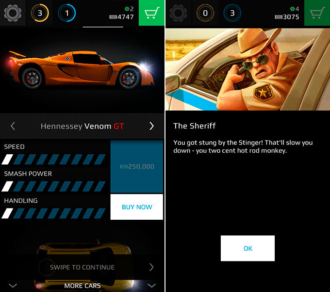Также в меню игры помимо открытия бонусов, можно покупать новые автомобили и улучшать их по трем направлениям. Smash Bandits постоянно подкидывает небольшие задания, выполнение которых приносит фишки. За них можно перебраться в полицейскую машину прямо во время заезда, закончившегося не в вашу пользу, и выйти из тюрьмы.