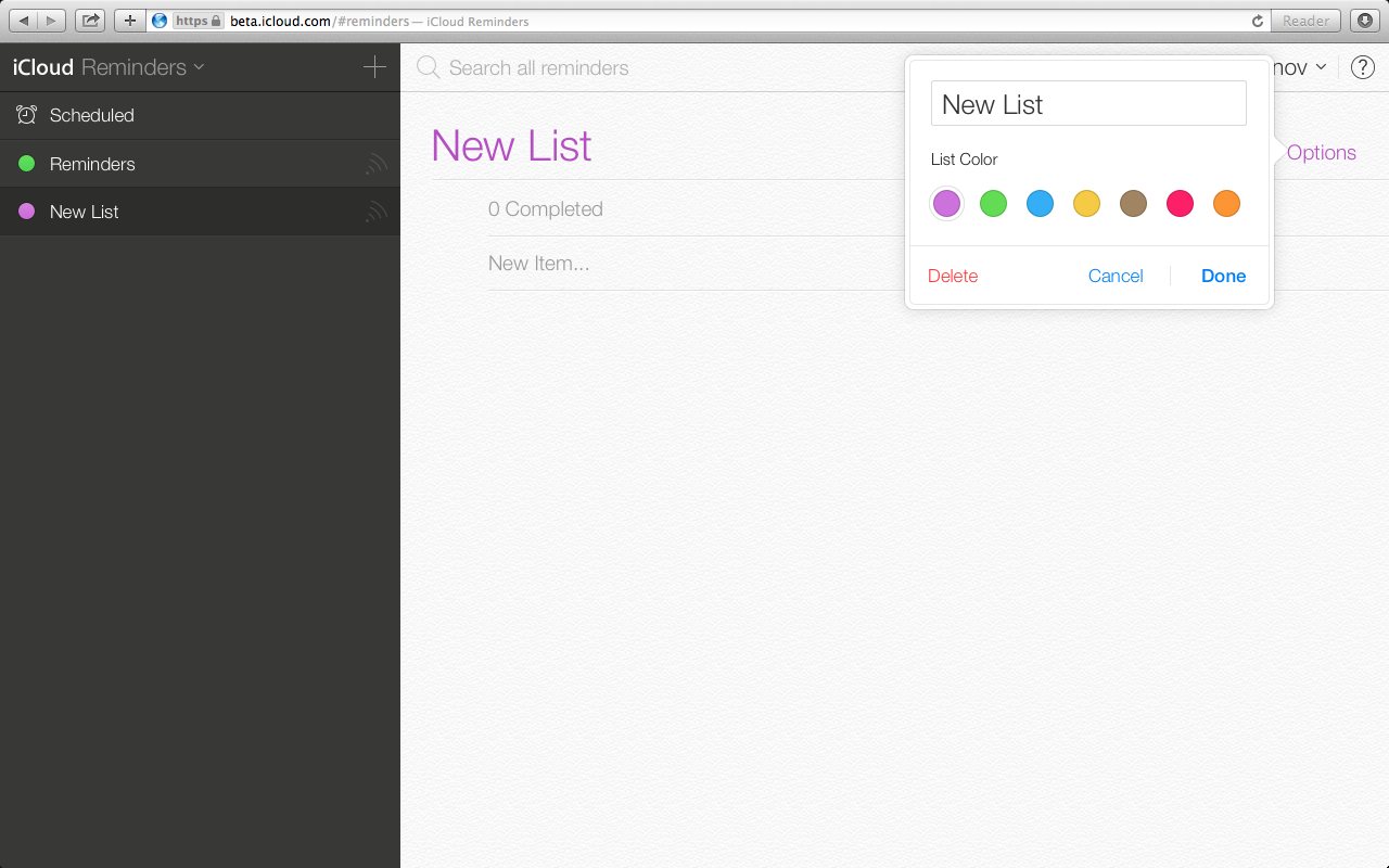 Раздел «Напоминания» практически полностью копируют аналогичное приложение в iOS 7. Единственное отличие — коричневый фон списка напоминаний в отличие от прозрачного в последней версии мобильной ОС компании Apple. С помощью кнопки Option в правом верхнем углу можно открыть меню создания нового списка с выбором цвета для него.