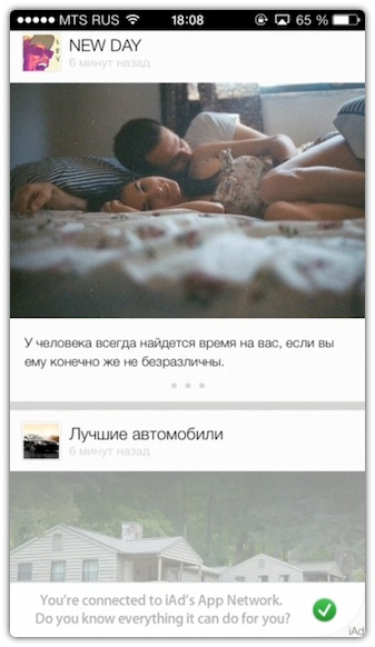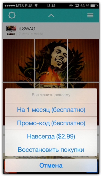 По словам разработчиков, их сервис по мере возможности старается фильтровать «проплаченные» посты пабликов. Механизм пока справляется постольку-поскольку, так как за неделю тестирования я насчитал три-четыре таких недобаннера. Кстати, о баннерах. Программа сама по себе бесплатна, а деньги девелоперам приносит небольшой рекламный блок внизу. Его можно отключить за деньги. Но если вы скачаете «Мяту» прямо сейчас и введёте в ней промокод: