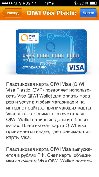 По умолчанию каждому пользователю выдается бесплатный счёт QIWI Visa Card. Но можно легко получить и пластиковую карту QIWI Visa Plastic — как из самого приложения, так и у нас на сайте. Иконка карты в программе осталась прежней, синей, хотя «пластик» нового образца выпускается в чёрном цвете. Но это не суть. А суть в том, что с помощью QIWI Visa Plastic можно расплачиваться в обычных магазинах, будь то супермаркет или заправка. И все эти счета контролируются через одно-единственное приложение — Visa QIWI Wallet.