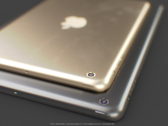 В этом году Apple отошла от традиции выпускать iPhone в двух цветовых вариантах. Помимо разноцветного iPhone 5c, свет увидел также третий золотой вариант окраски для iPhone 5s. Вдохновленный новыми веяниями, хорошо знакомый нам дизайнер Мартин Хайек решил поразмышлять на тему iPad mini в золотом корпусе и, более того, оснащенного биометрическим сенсором Touch ID.