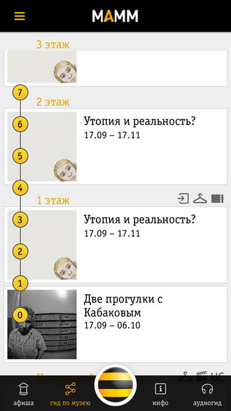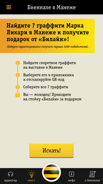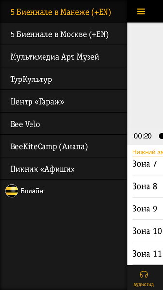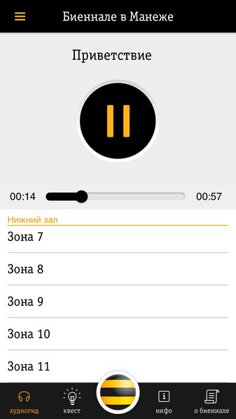 Современное искусство как никакое другое нуждается в контексте — объяснении того, что подразумевает та или иная картина или инсталляция. Аудиогид, встроенный в приложение Bee IN, поможет понять смысл происходящего в Манеже. А разделение на главы по зонам экспозиции и залам не даст запутаться. Есть как русский, так и английский язык голосовых записей, специально для тех, кто хочет взять с собой иностранных гостей. Обратите внимание, что для их первичной закачки потребуется подключение к интернету.