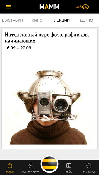 Аудиогид доступен и для посетителей МАММа — Мультимедиа Арт Музея. Для него можно посмотреть планы ближайших выставок и лекций с описаниями и даже фотографиями. Если же хочется что-то поактивнее, возьмите велосипед Bee Velo по адресам, указанным в приложении, и колесите по Москве. Велосипеды очень яркие, здорово привлекают внимание.