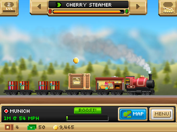 Все части подразделяются по типам локомотивов. Также для сборки нового паровоза необходимо потратить определенную сумму монет, также затраты придется понести при выводе его непосредственно на рельсы. Отправив состав в путь с грузами, можно заняться другими делами или просто понаблюдать за движением поезда по 8-битной, но чертовски красивой местности. Чем-то это напоминает движение модели поезда на игрушечной железной дороге. Ощущения очень похожи.