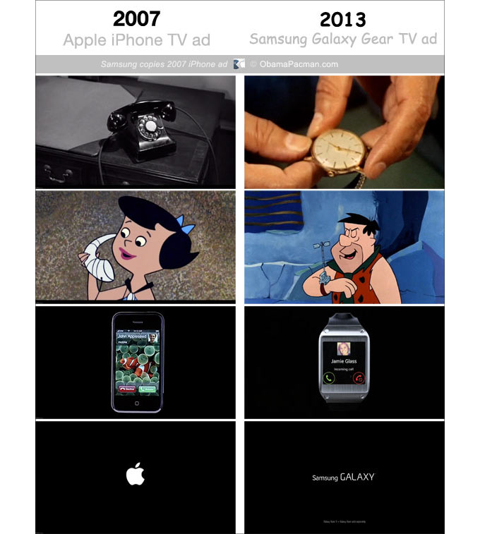 Samsung совсем не против заимствования успешных идей у ближайших конкурентов. Думаю, нет нужды в очередной раз поднимать всю историю противостояния корейского технологического гиганта с Apple, поэтому обратимся сразу к последнему витку этой истории. На сей раз маркетологи Samsung вдохновлялись рекламой самой первой модели iPhone, создавая ролик для продвижения «умных» часов Galaxy Gear.