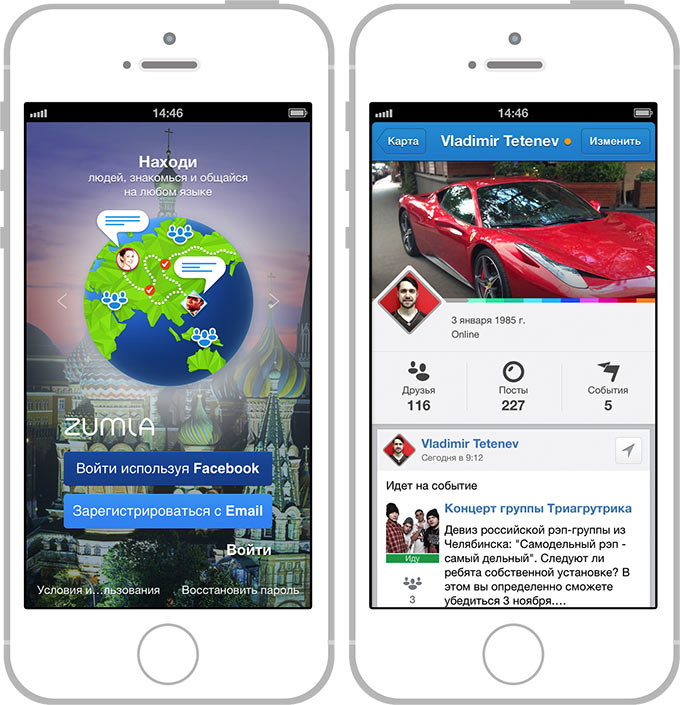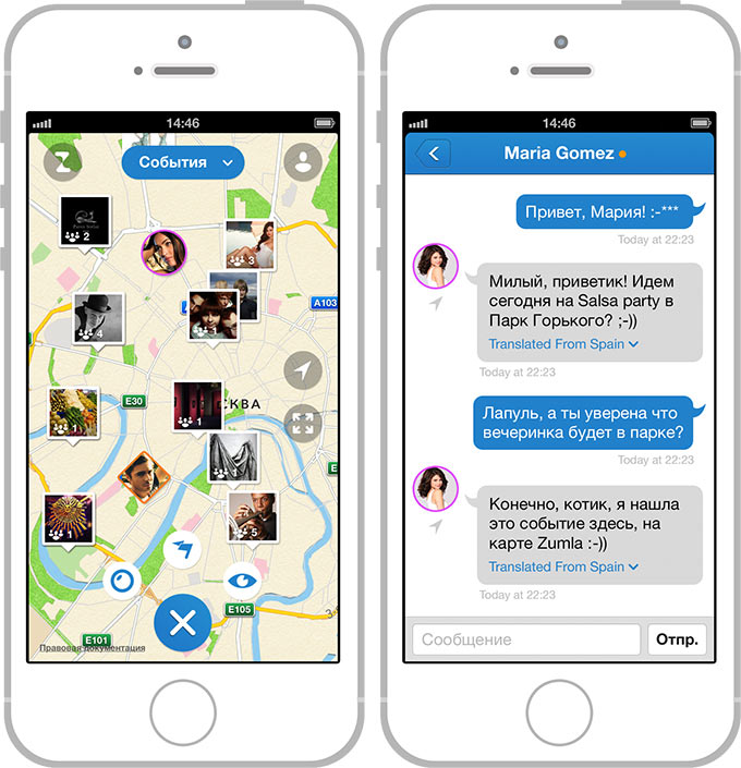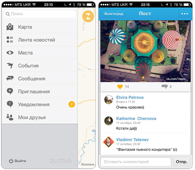 Как вы заметили, в основе интерфейса Zumla лежит именно карта, а если точнее, то карта мира. На ней отображаются интересные события, фото и сами пользователи. Более того, сервис не лишен традиционной социальной составляющей, включая чат, комментарии, лайки, репосты и прочий фан. Вам уже вспомнились чем-то в отдаленной степени похожие Foursquare, Banjo или упомянутый выше Instagram? Но у них нет возможности «живого» общения, как в Zumla, что выгодно его отличает.