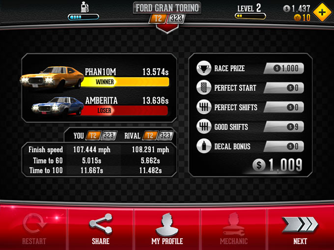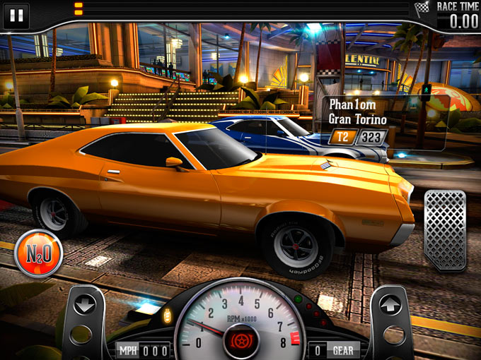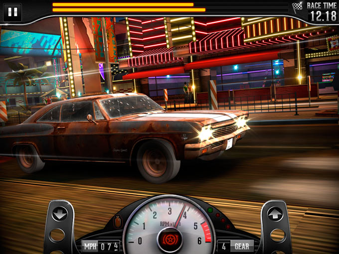 Теперь к заездам. Драг-рейсинг – единственный и основной вид гонок в CSR Classics. Правила просты: участвуют только две машины, а побеждает тот, кто пересечет финишную черту первым. Сам заезд можно условно разделить на три этапа. Сначал необходим хороший старт, как залог будущей победы. Используя педаль необходимо удержать стрелку тахометра таким образом, чтобы горела зеленая лампочка – это даст наилучший старт. Затем необходимо своевременно переключать передачи. Опять же ждем зеленой лампочки и повышаем передачу. Чем точнее мы это делаем, тем лучше машина набирает скорость. Наконец, где-то на середине пути необходимо активировать ускоритель, иначе это сделает соперник и угнаться за ним уже не удастся. И снова важен момент.
