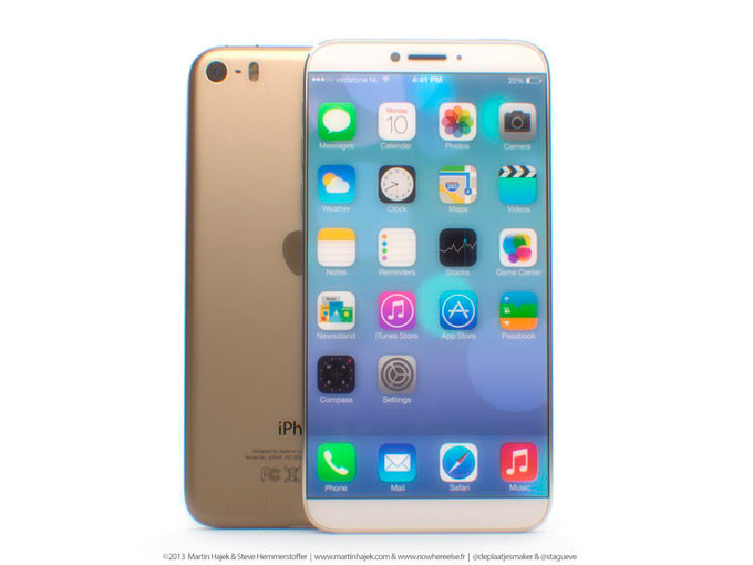 Теперь взглянем на творчество Мартина Хайека. Дизайнер пошел на поводу у последних сообщений в средствах массовой информации, сватающих в следующее поколение iPhone увеличенный дисплей. В своей работе Хайек растянул экран смартфона почти до 5 дюймов – размер дисплея равен 4,8 дюйма. Однако обращает на себя внимание даже не это, а отсутствие Touch ID на лицевой панели. Более того, там нет больше привычной клавиши Home. Вместо этого, чтобы сохранить примерные размеры устройства, экран был растянут почти на всю переднюю часть смартфона.