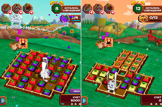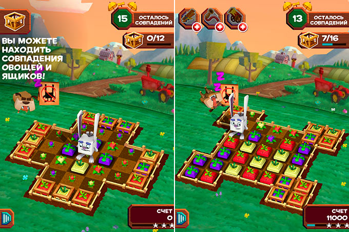 Игровое поле, или огород, поделено на клетки, каждая из них содержит овощ или его росток. Наша задача не просто бездумно хватать все, что плохо лежит, а собирать заданные игрой последовательности. Например, необходимо собрать пять красных овощей. Для этого мы должны сложить на голове у кролика последовательность из трех, четырех или пяти овощей одного цвета, в данном случае красного.