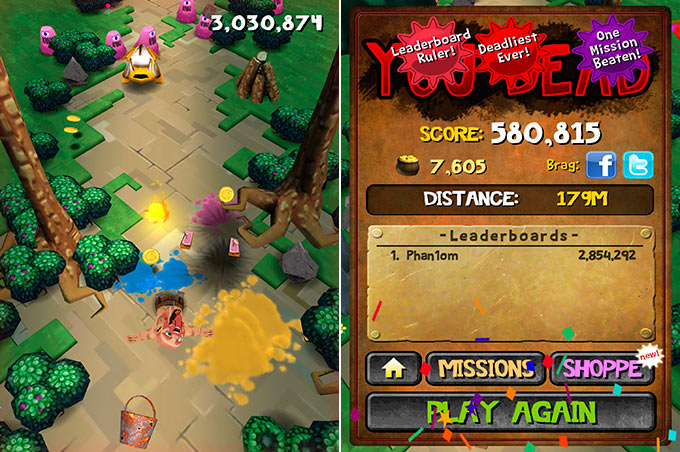 Движения героя полностью автоматизированы. Точнее наш упрямый викинг бежит строго по прямой. Все надежда в пути на топоры, которыми мы обладаем в неограниченных количествах. Именно они убивают монстров и расчищают нам путь от немногочисленных препятствий. Более того, топоры служат, чтобы подбирать монеты и драгоценные камни. Словом, топоры – наше все. Для броска необходимо провести пальцем от персонажа в требуемом направлении. При этом траекторию можно нарисовать не только самую простую, но и весьма замысловатую. Оружие полетит, как и было задумано. Стоит только делать поправку на динамику игры.