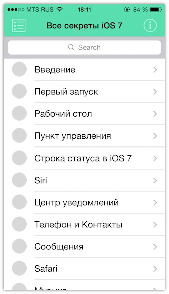 Приложение по своей структуре напоминает небольшую книгу-справочник. Повествование начинается с общей информации про iOS 7 и различных моментах, о которых необходимо знать — к примеру, список совместимых устройств. Предлагается вполне себе подробная инструкция о том, как можно установить «семёрку» на любое устройство, включая методы с использованием iTunes. Дальше начинается секция советов: что куда пропало в сравнении с iOS 6, куда для чего нужно нажать — и куда нажимать не надо. Ожидаемый контент от такого рода программы, с вкраплениями интересных мелочей.