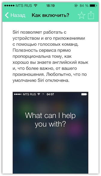 Полезные советы для iOS 7 покрывают все основные (и не очень) вопросы любого начинающего пользователя. Если бы мне пришлось устанавливать новую ОС подруге или родным, я бы заранее пожалел свои нервы и скачал бы эту программу из App Store в первую очередь. Того и глядишь, меньше неожиданных звонков по ночам будет с вопросами, типа «как включить Siri-мужика». iOS 7 не стоит на месте, и некоторую информацию в программе уже можно обновить — к примеру, добавить в список поддерживаемых устройств новые iPad. Апдейты уже обещаны.