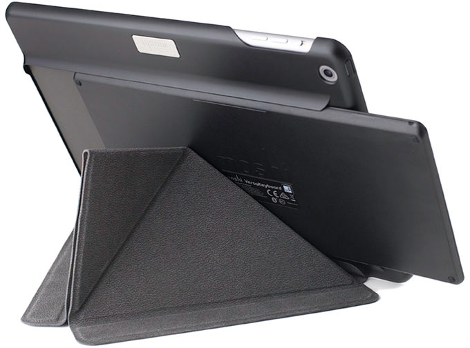 Аксессуар получил название VersaKeyboard и очень необычную конструкцию. Вероятно, дизайнеры Moshi вдохновлялись оригами, создавая данный чехол. Задняя поверхность iPad Air защищается пластиковой накладкой, повторяющей форму корпуса устройства. К ней же на своеобразных салазках крепится беспроводная Bluetooth-клавиатура. Лицевая панель планшета прикрывается аналогом Smart Cover, выполненным под кожу, и обладает парой уникальный функций.