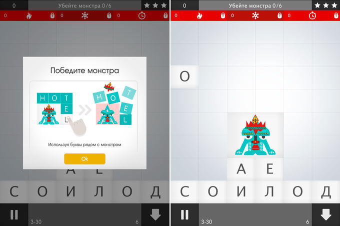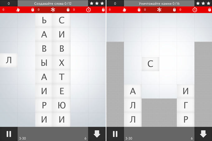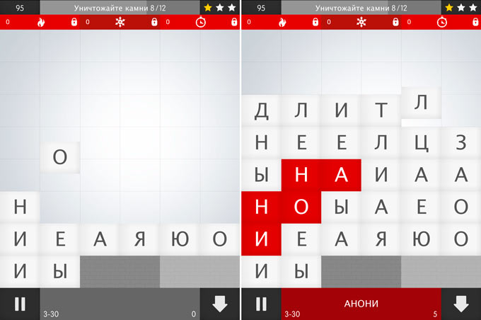 Из букв, которые выпадают в случайном порядке, необходимо составлять слова. Собранные в слова буквы тотчас исчезают с игрового поля. Буквы можно выбирать в любом месте и совсем не обязательно, чтобы они находились рядом. Но если вам удастся собрать слово из букв, расположенных рядом, проведя по ним пальцем, то уничтожатся не только буквы в составе слова, но и строки, содержащие эти буквы. К сожалению, такая возможность выпадает нечасто.