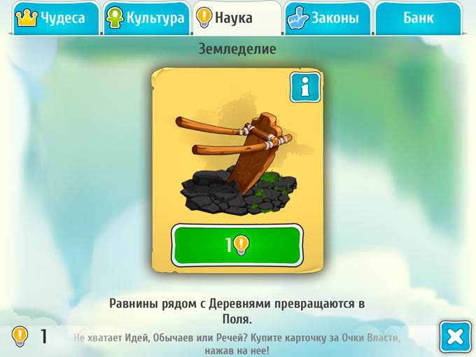 Разведчики в «Построй империю» выполняют роль поселенцев. Они прибавляют к нашей территории новые клетки, расширяя ее и приближая нас к соседям по континенту. Боевые юниты понадобятся для выяснения отношений с другими цивилизациями или варварами. Но есть и отдельная категория юнитов, которая отвечает за производство ресурсов. Эта особая категория ресурсов идет на развитие науки, культуры и принятие законов. Три данных раздела расположены отдельно и каждый представлен собственным набором карточек, которые мы будет периодически открывать. Каждая карточка также содержит небольшую текстовую справку с исторической информацией.