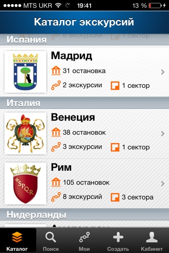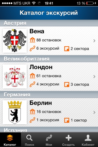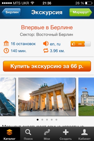 Для «продвинутых» путешественников в Аудио Тур Azbo возможна функция составления собственного маршрута, но для этого нужно не только купить пару-тройку готовых экскурсий, но и хорошо знать город. Кроме этого, в таббаре можно найти поиск экскурсий, разделённых по длительности или по протяжённости и личный кабинет, где хранятся все загруженные карты.