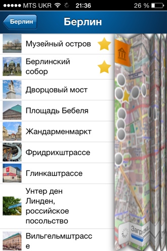 На саму карту нанесены серые точки, обозначающие основные достопримечательности, посетить которые просто обязан каждый турист. Тапнув на каждую из них, всплывёт визуальная подсказка-фотография, название подходящей экскурсии и секторальная зона, в которой находится это место.